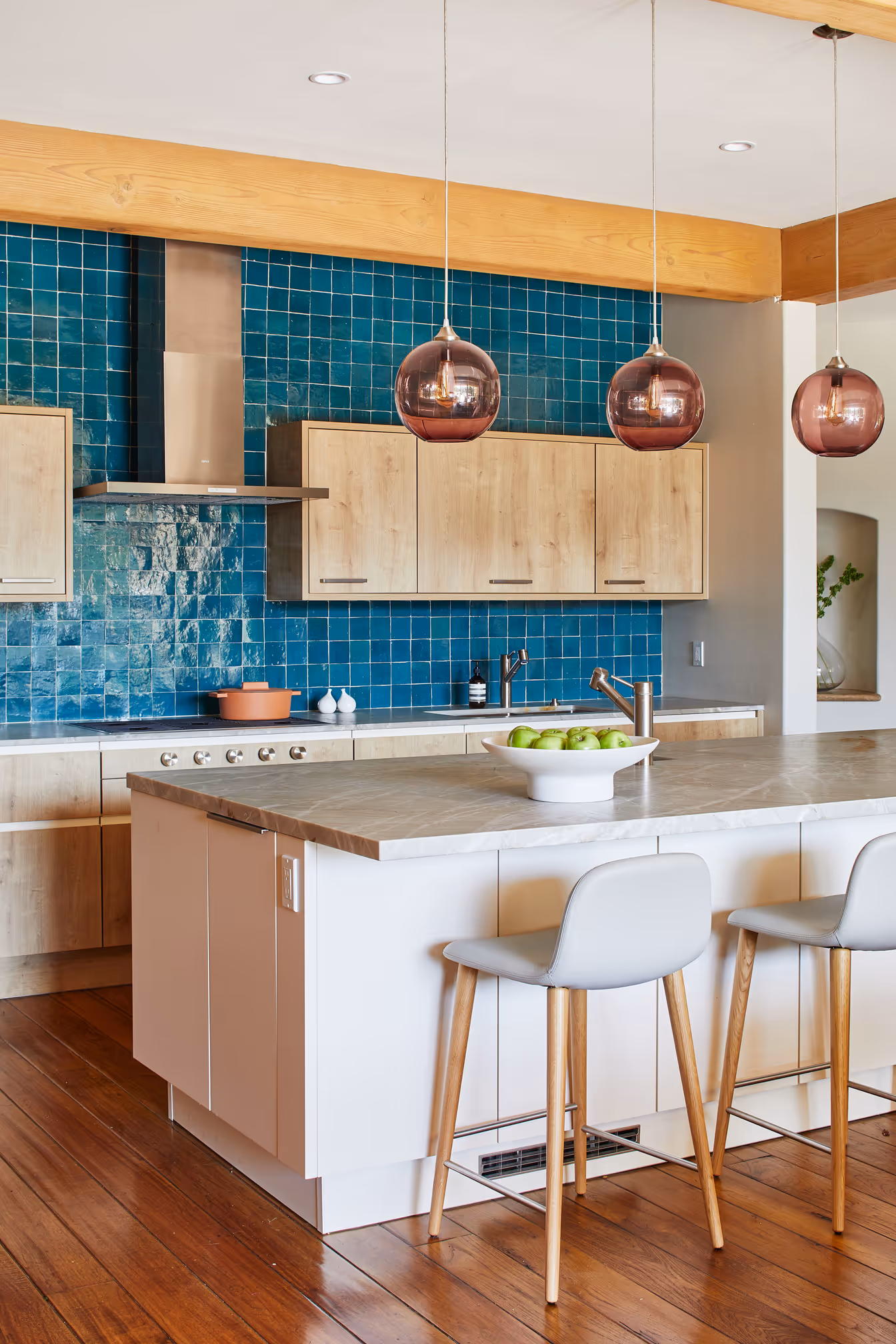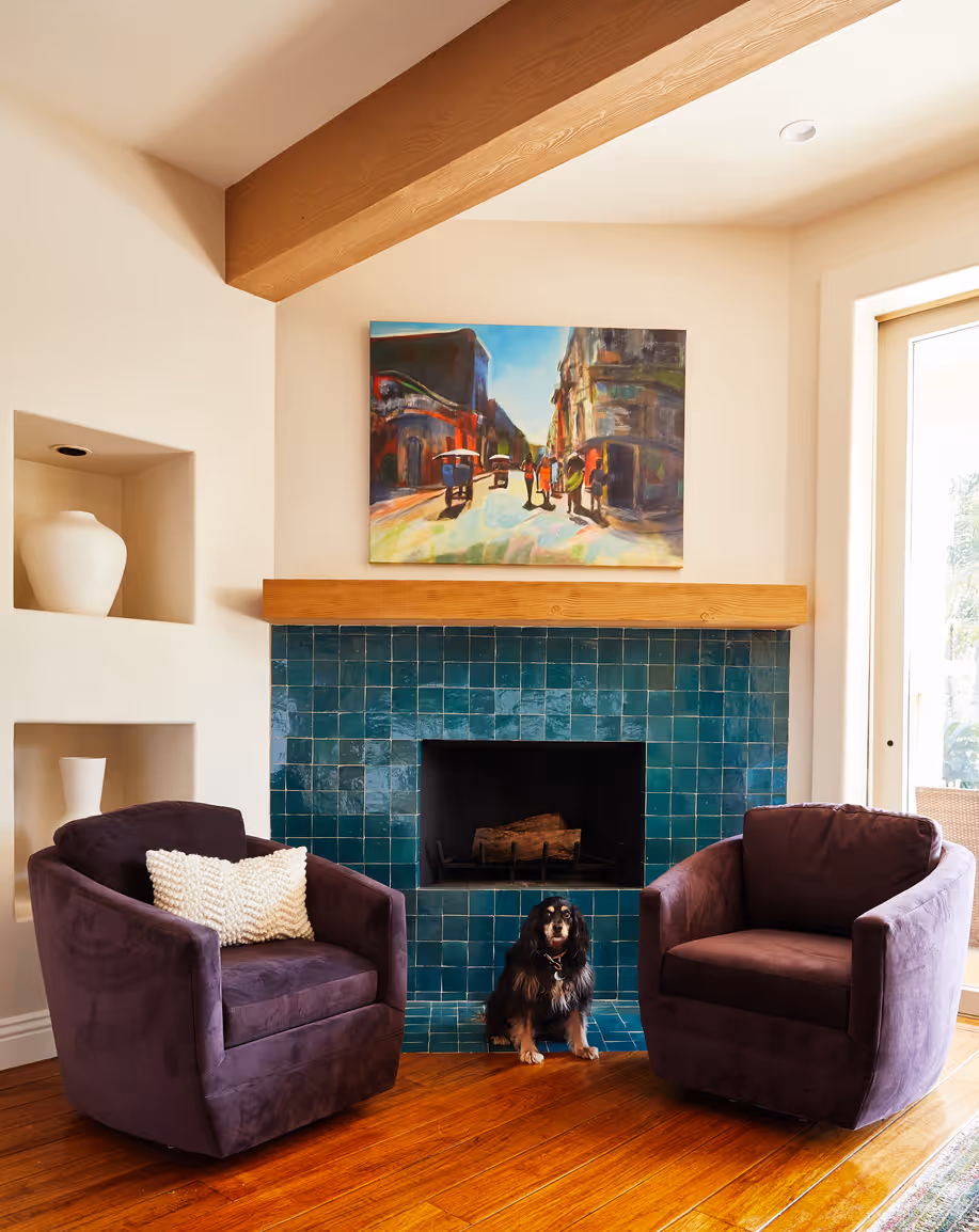 Across the kitchen, a custom feature tile wall brings a subtle Mediterranean rhythm, harmonizing with the newly lightened beams, refinished floors, and sculptural hood. These touches ground the home’s history while infusing it with the fresh ease of modern Mediterranean interiors.