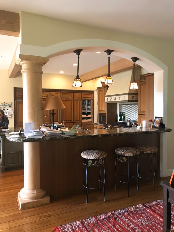 The proposed design re-established harmony within the home’s Mediterranean framework. Removing a heavy archway opened the kitchen to the family room; a generous new island invited gathering and conversation. Clean-lined cabinetry and sculptural lighting introduced a modern sensibility, while warm woods, textured tile, and soft arches honored the home’s heritage.